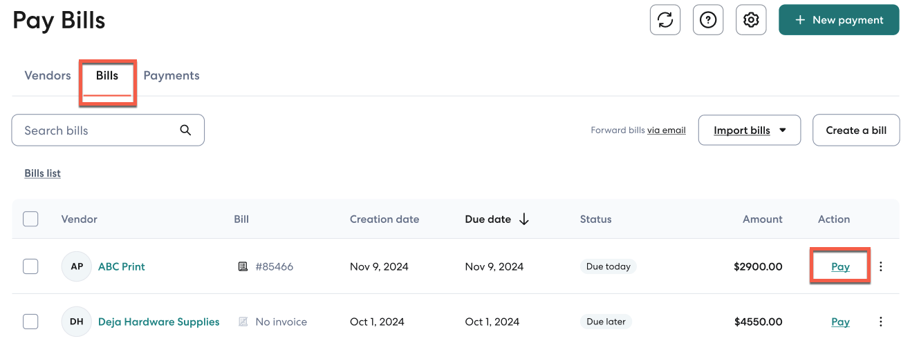 You can pay a new bill by syncing with QuickBooks Online. This will import all your existing bill information in QuickBooks Online to your Pay bill dashboard, where you can pay them.