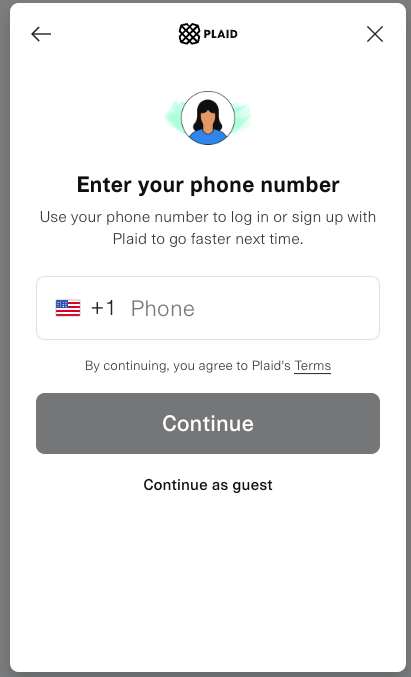 5- You can then enter your phone number to log in or sign up with Plaid. Alternatively, you can continue as a guest.