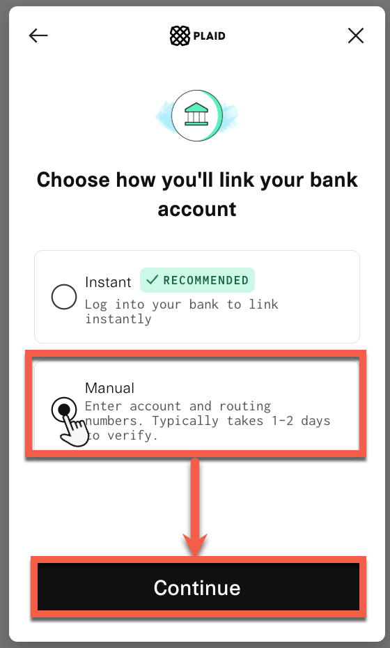6- Select Manual when asked how you’ll link your bank account. Select Continue.