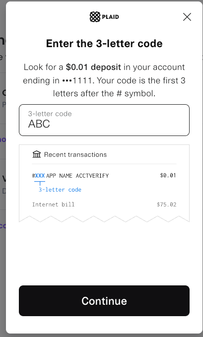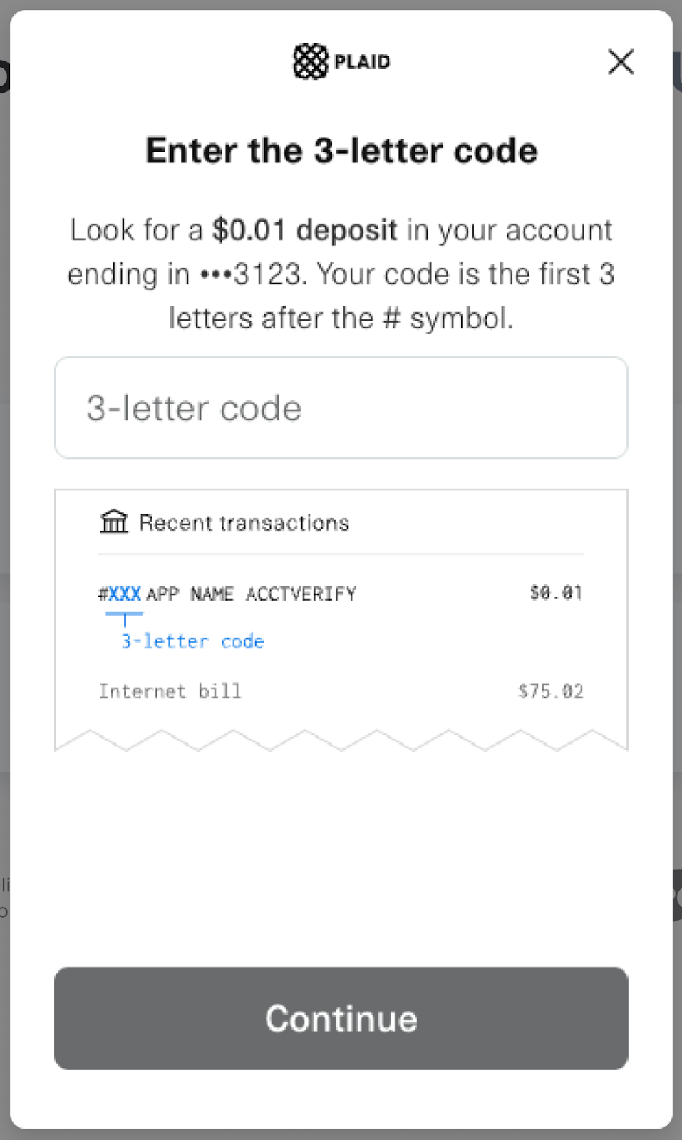 Plaid will send a text message to the mobile phone number you added. The message includes a link where you can enter the 3-letter code attached to the micro-deposit amount.