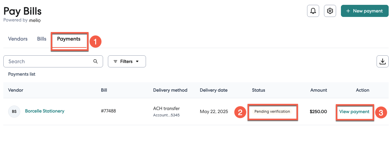 If you added a new bank account when making a payment, Bill Pay will remind you that action is needed to complete the payment successfully.