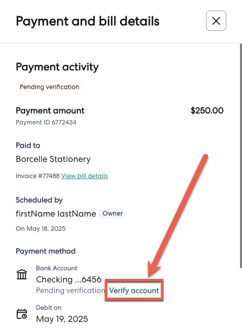 3- Your newly added bank account will appear in your list of available payment methods, marked as "Pending Verification." Select Verify account located next to this bank account to begin the verification process.