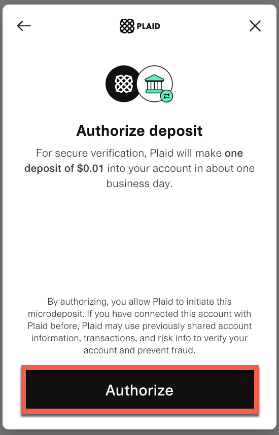 9- Authorize Plaid to deposit a small amount of money into your bank account. Select Authorize.