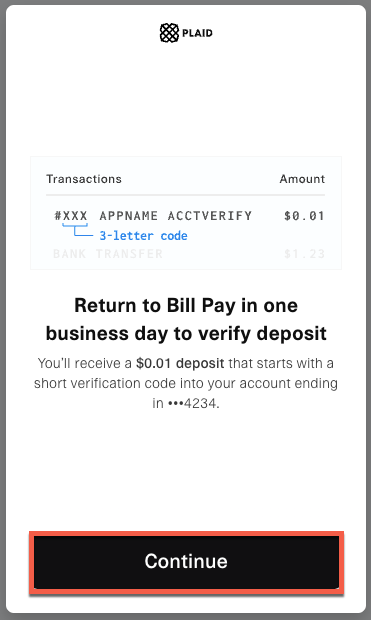10- You’ll receive the micro-deposit in one business day and can then verify your bank account. Select Continue.