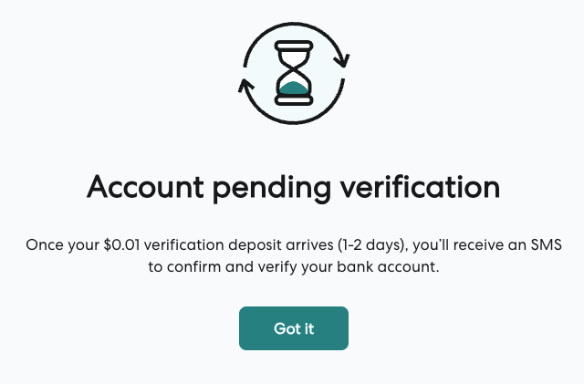 11- Your new bank account is now pending verification. You can complete your payment as usual, but it will only be processed after the bank account you added is successfully verified. To return to the Dashboard, select Got it.