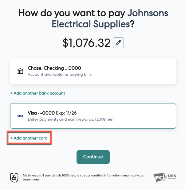 8. Next, you need to choose how you would like to pay. To pay by adding a new card, select + Add a card.