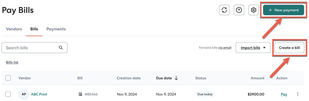 4. In the Bills tab, you can create a new bill by selecting either Create bill or + New payment. This will lead you to the Bill details screen.