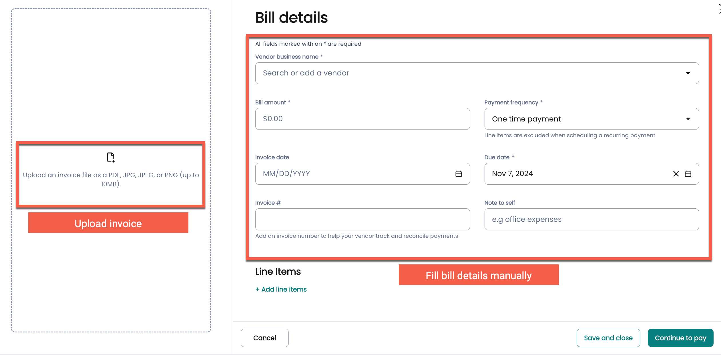5. Now, you can manually enter the bill details for the payment you want to create or upload an invoice to input the bill details automatically.