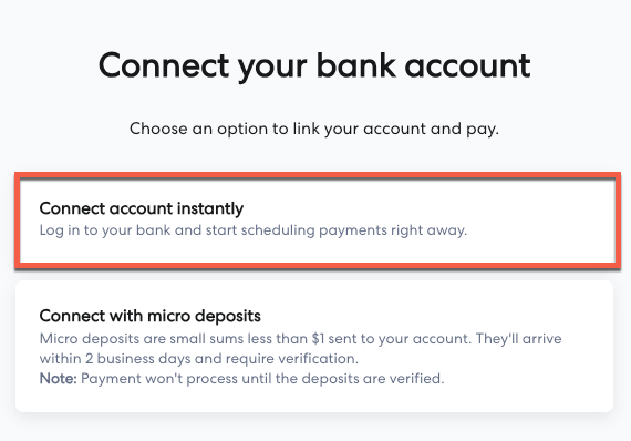 9. Select Connect account instantly when asked how to link your account. You will now be asked to connect your account instantly using your bank account login credentials to verify your bank account details.