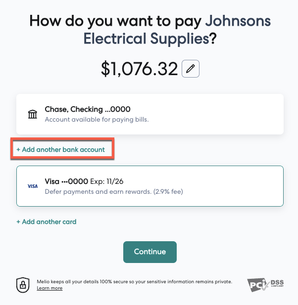 8. Next, you need to choose how you would like to pay. Select + Add another bank account to add a new bank account.