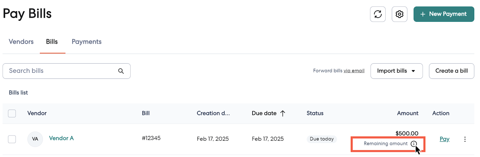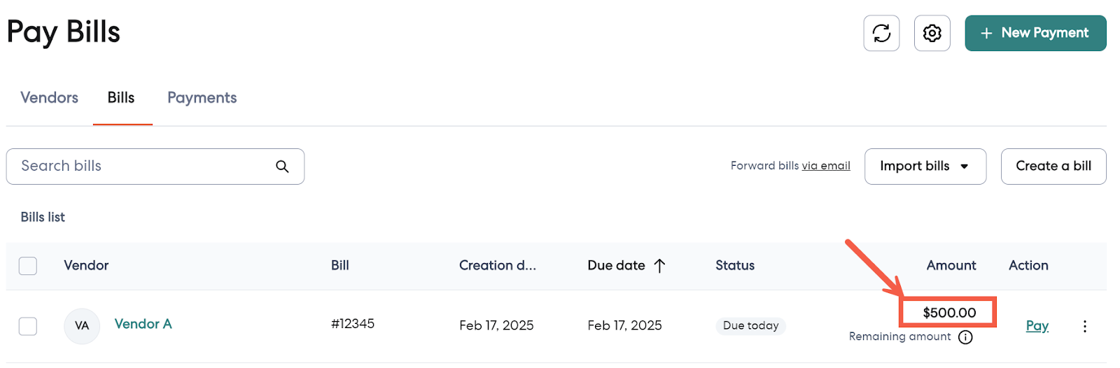 2 - In the Amount column, you’ll see the balance left to pay.