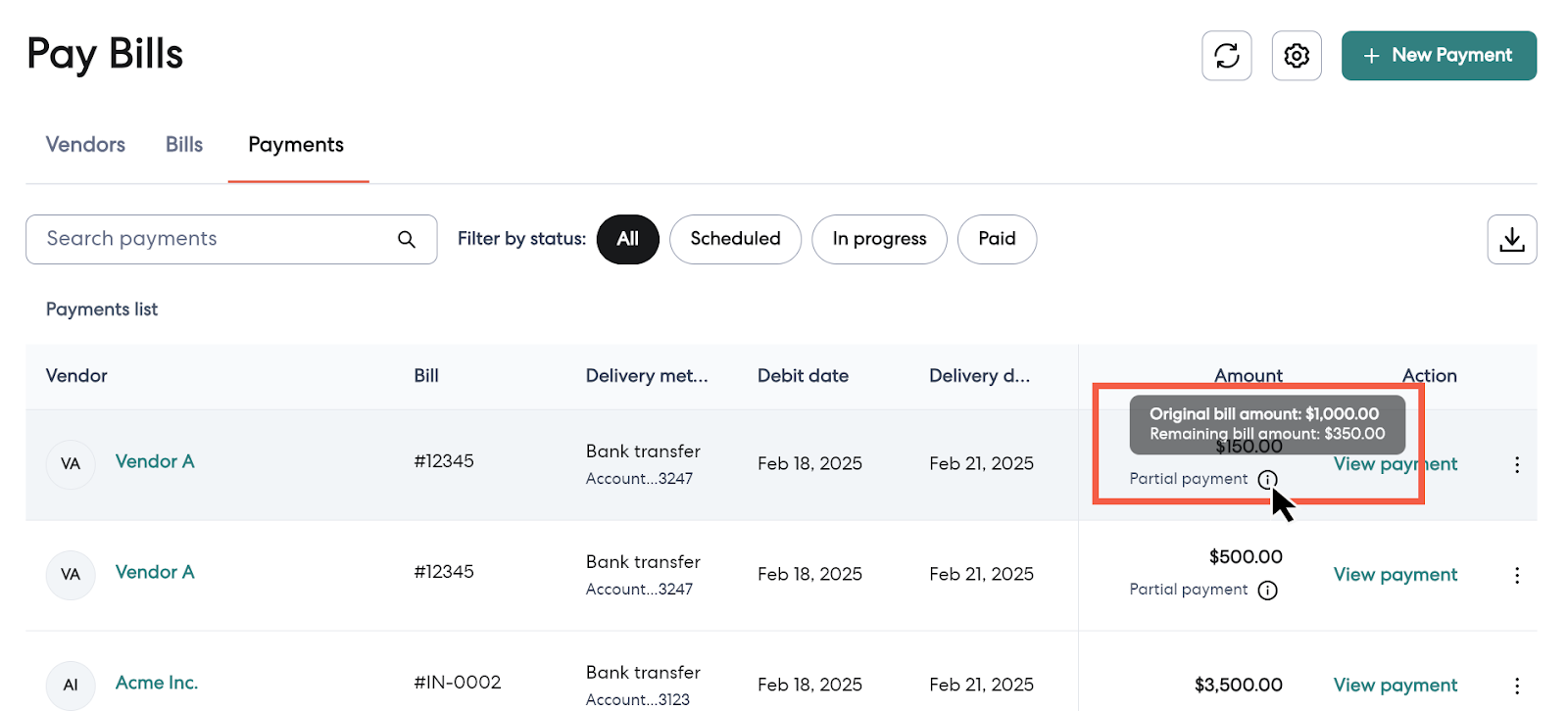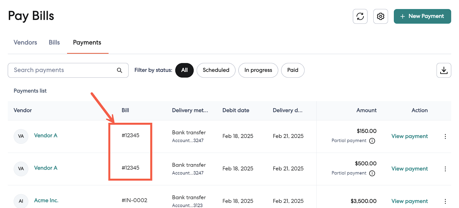 - In the Payments tab, partial payments related to the same bill will appear separately, but they share the same invoice number.