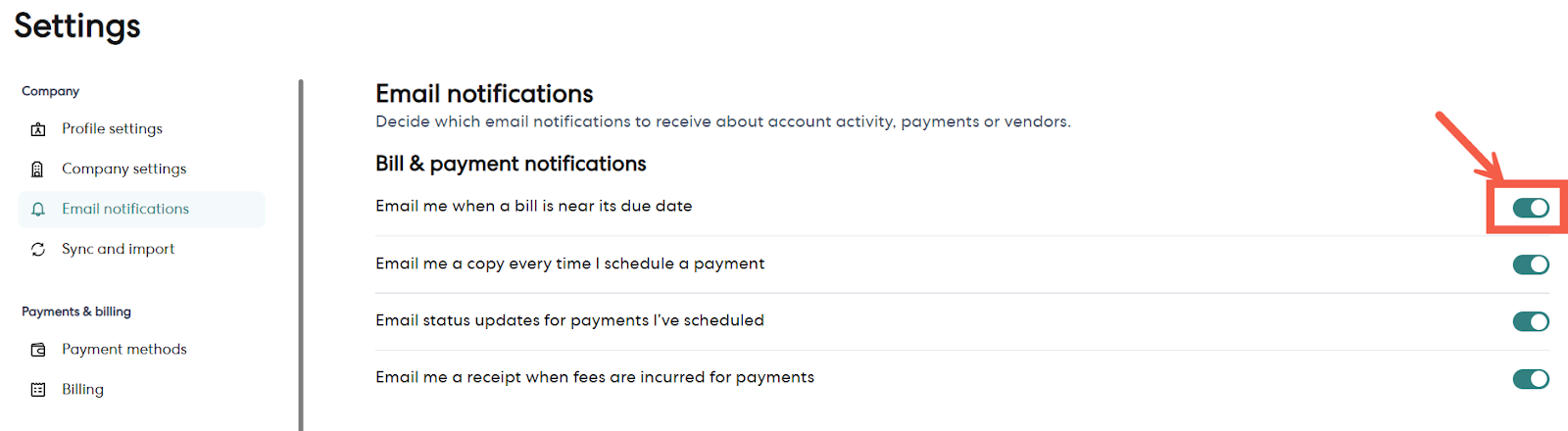 5 - Check if the “Email me when a bill is near its due date” notifications are turned on. If not, switch the toggle.