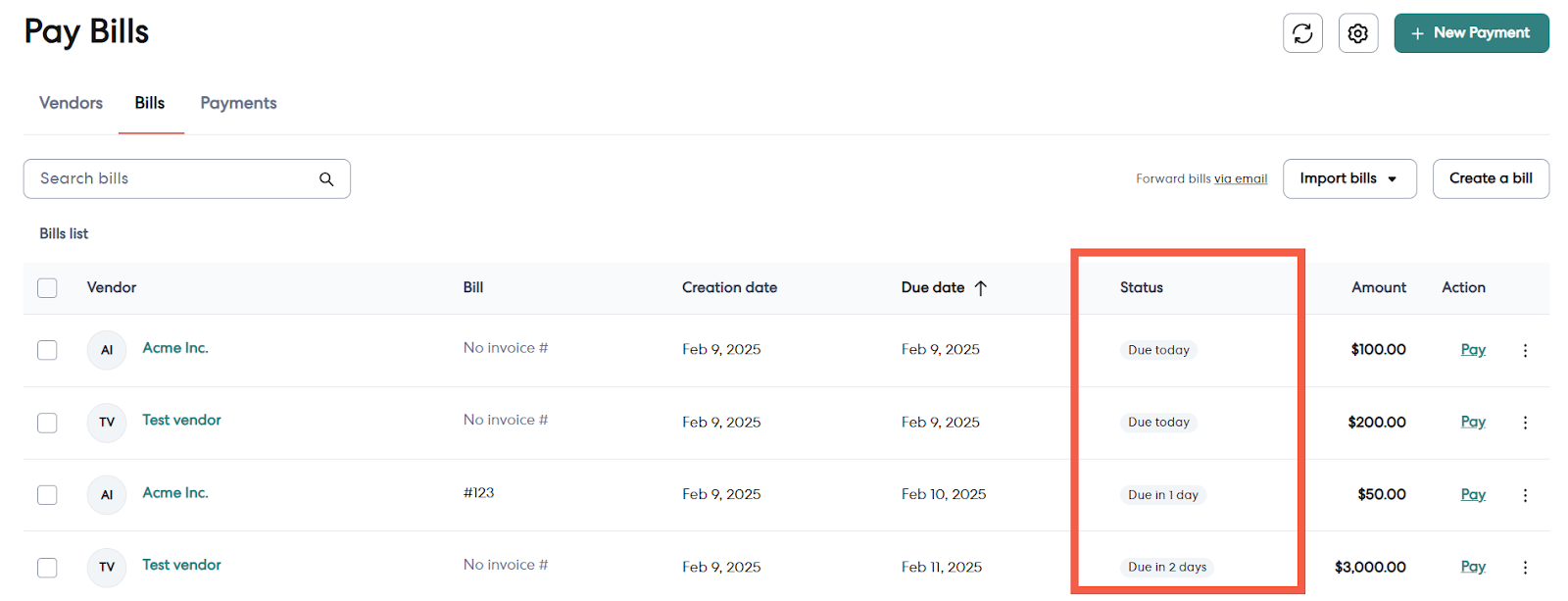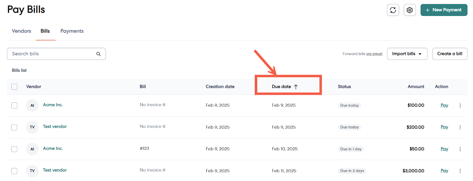 All of your unpaid bills appear in the Bills tab. Each bill is listed and includes important information like the status of the bill, the amount, the vendor, and the due date. In the Bills tab, you can easily filter your list of bills to find those that are nearing their due date or past due. To do this, follow the steps below.