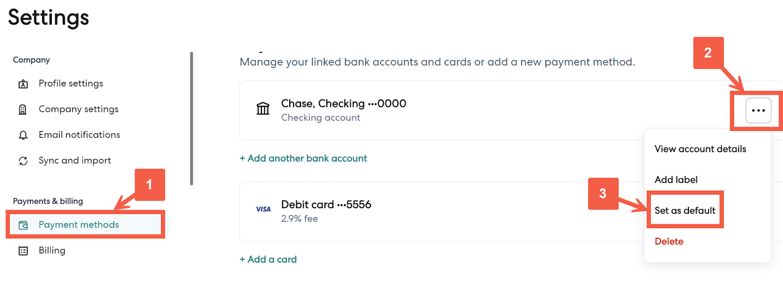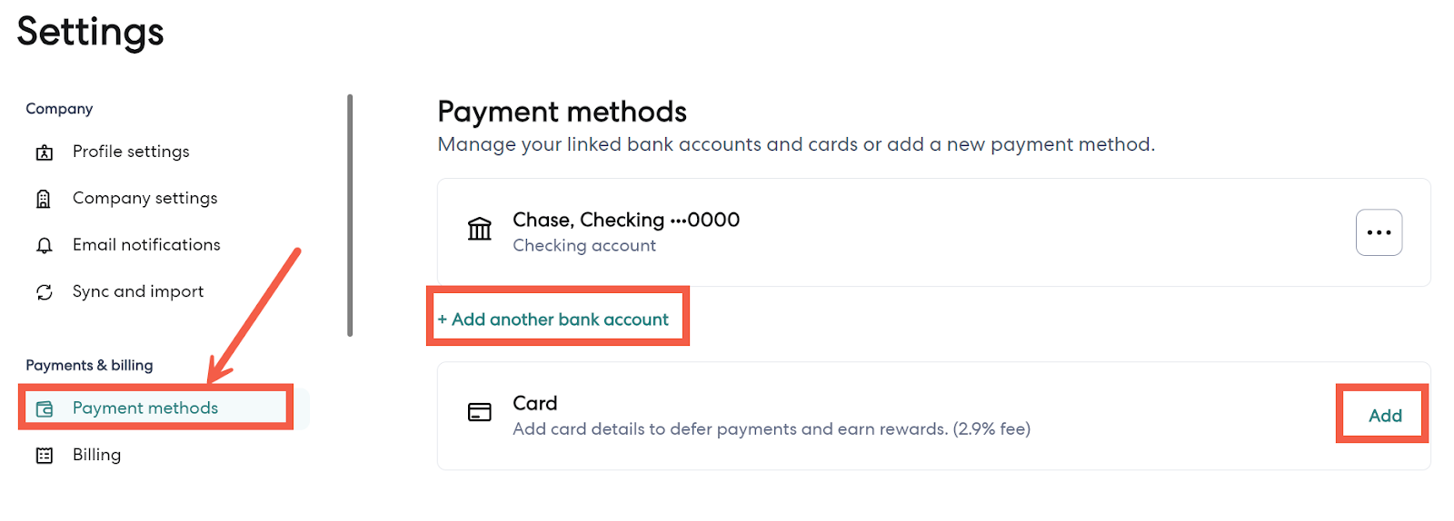 - Go to your Settings page and select Payment methods. Follow the steps to add a new card or bank account.