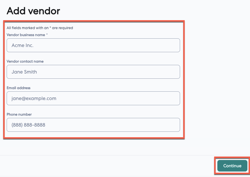 4- Enter the vendor's contact details in the Add vendor screen. Select continue when done.