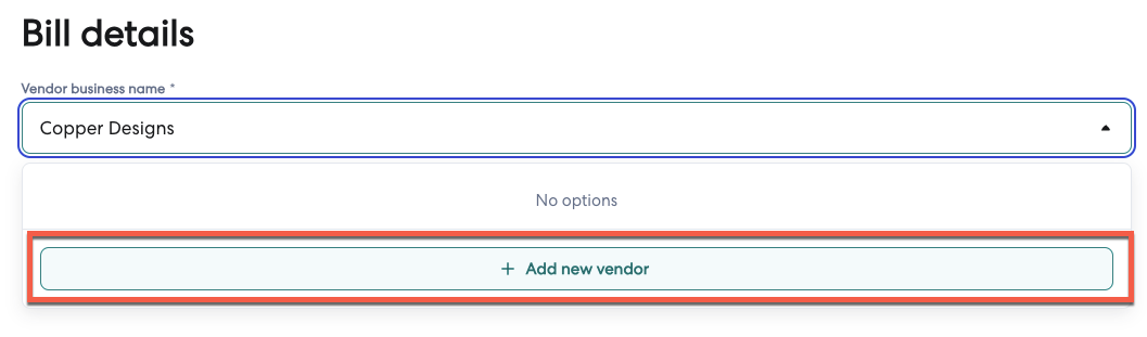 4- In the Bill details page, type in the vendor’s name in the Vendor business name field.