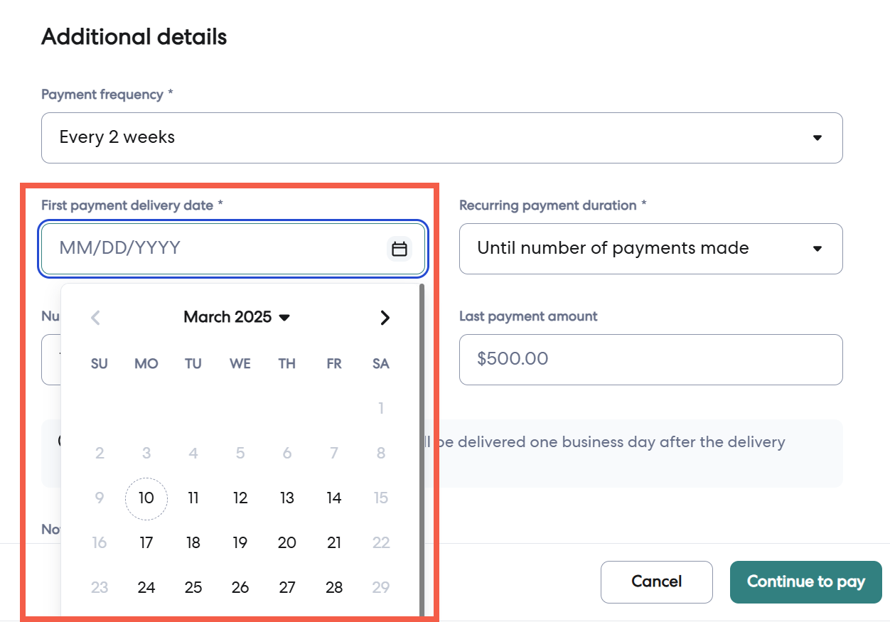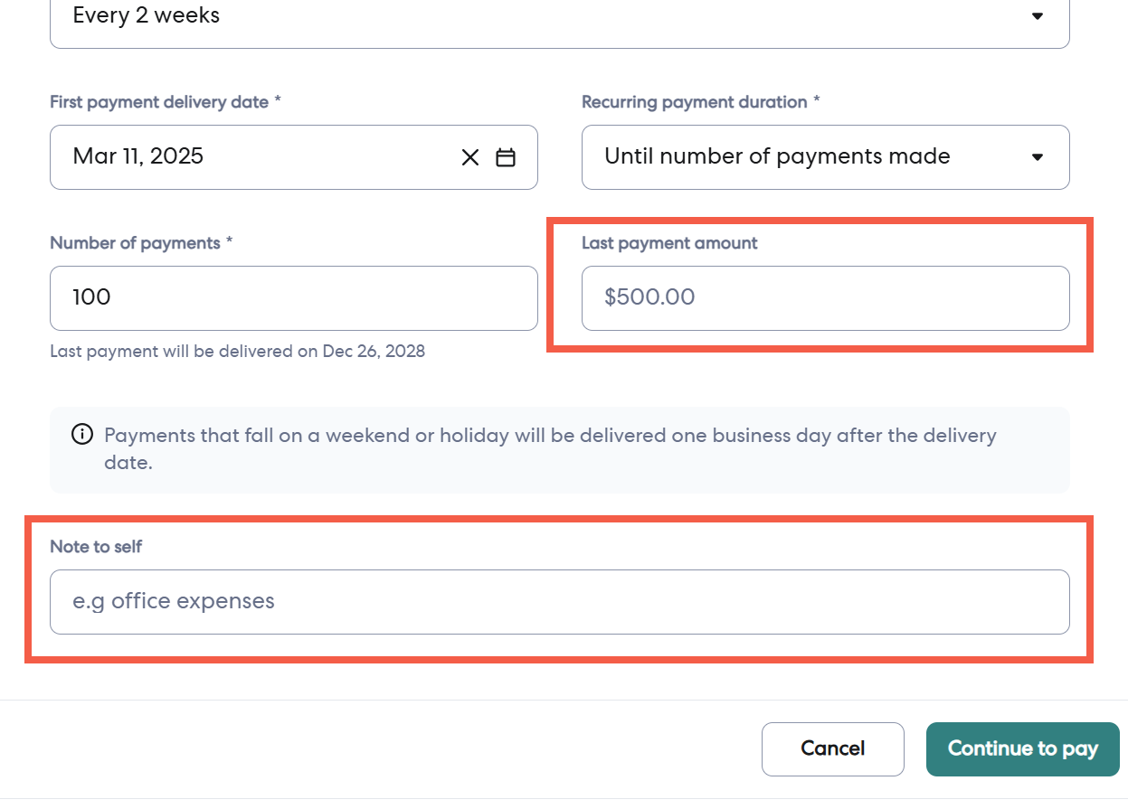 - The last payment amount: If you wish to set a different payment amount for the last recurring payment.