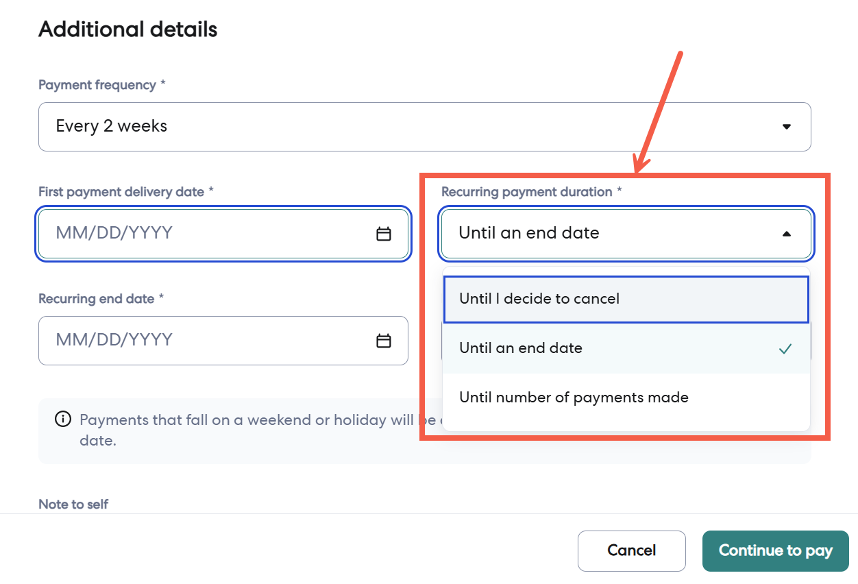 - Until a certain number of payments are made: You will need to select the desired number of payments.