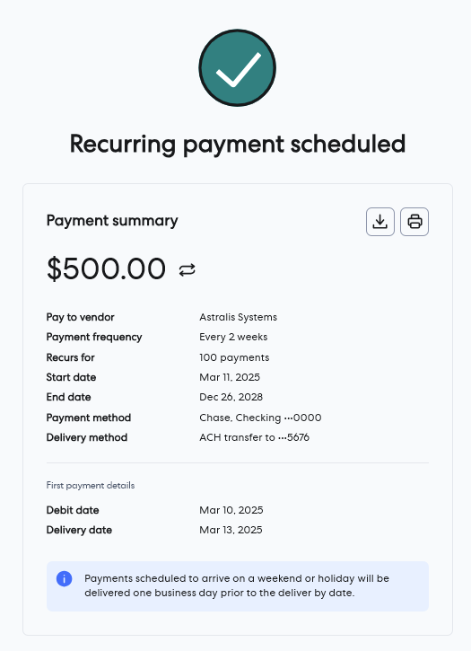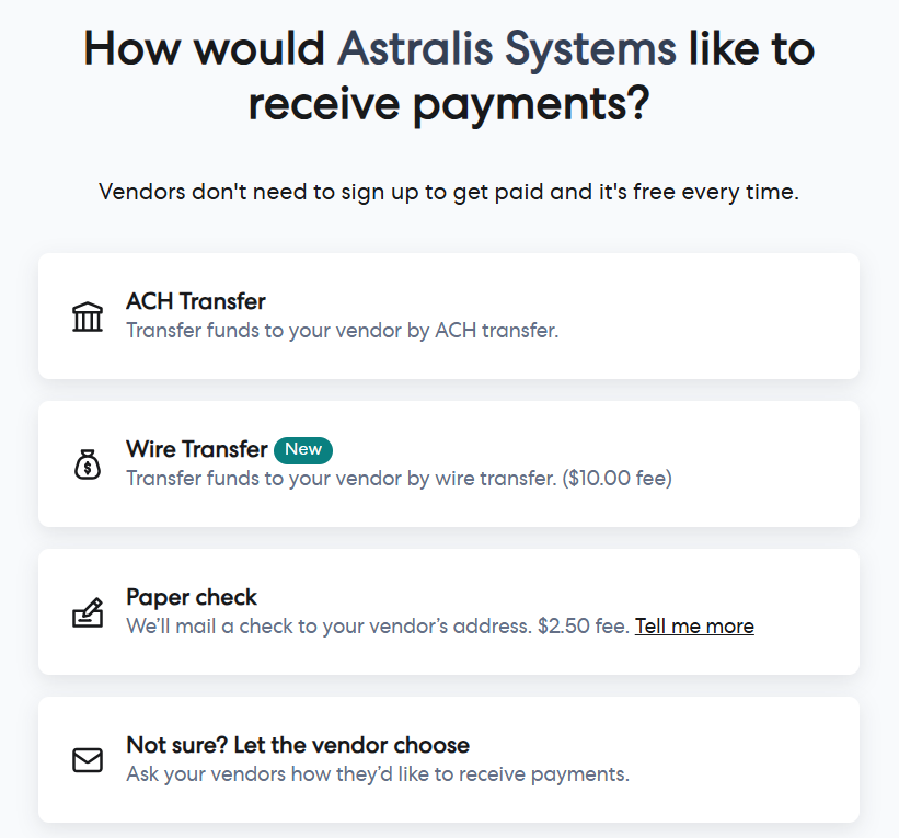 - Or let the vendors choose for themselves. Their preference will be saved for future recurring payments they receive.