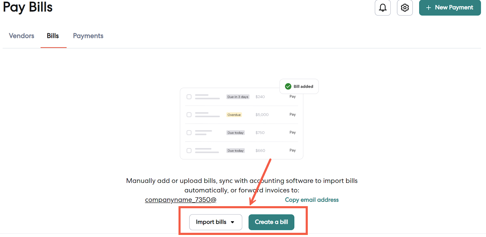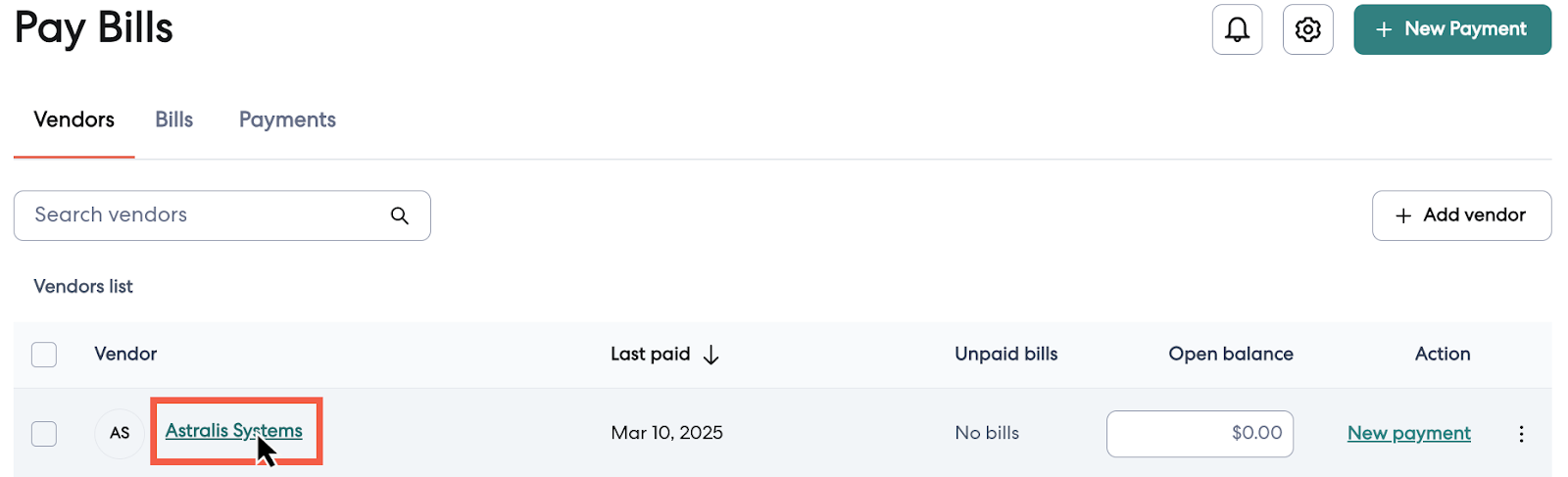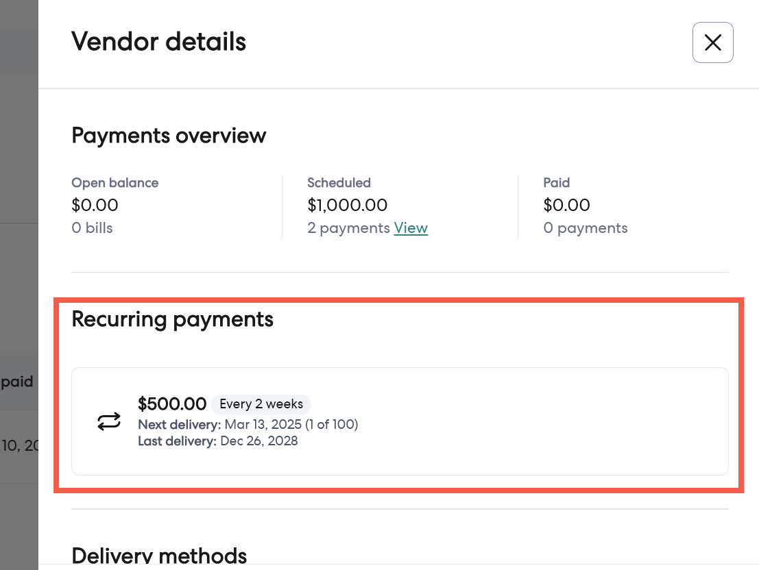 If this is the first time you’re paying this vendor, you’ll need to fill out the payment delivery details. Enter the vendor's bank account details for a bank transfer or enter a business address if you want them to receive checks.