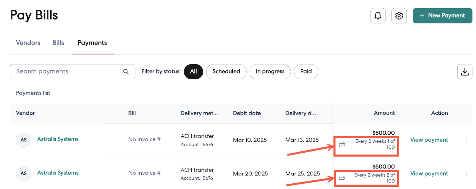 2 - In the payments list, look for the recurring payment icon in the Amount column.