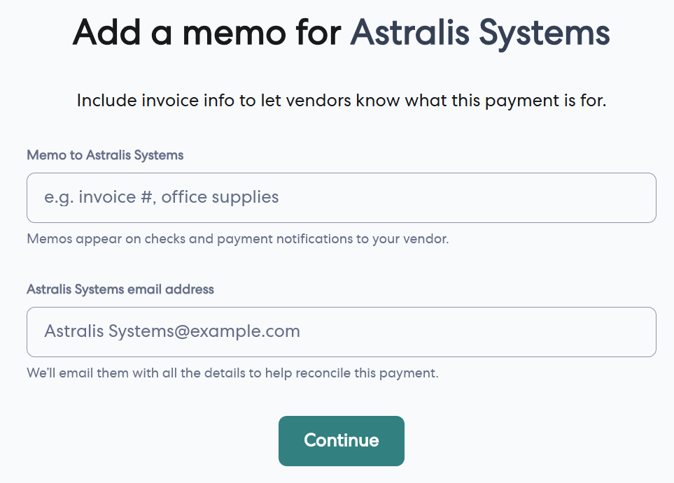 12 - Add a memo and vendor’s email (this is an optional step). Then, select Continue.