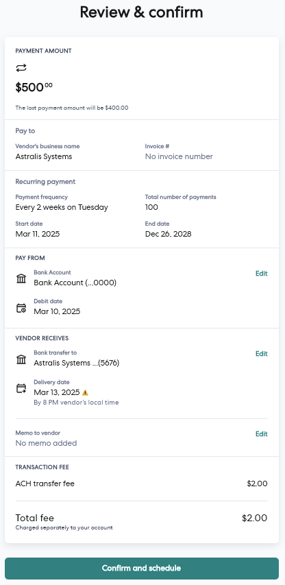 14 - If everything looks good, select Confirm and schedule at the bottom of the screen to complete the process.