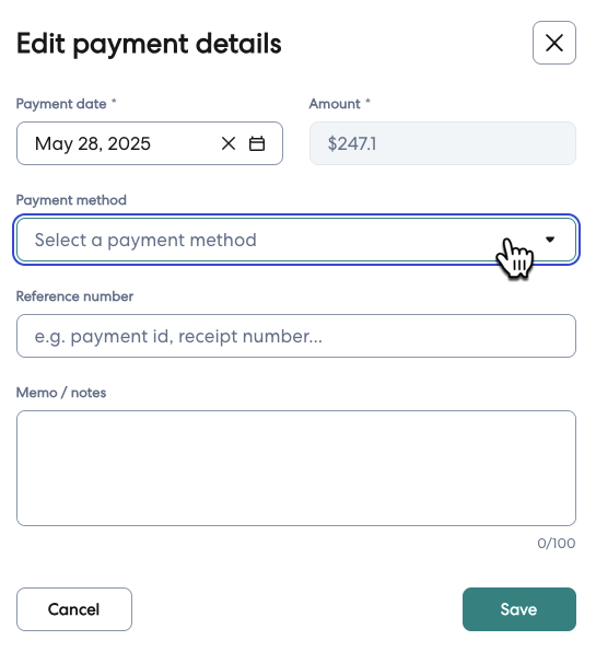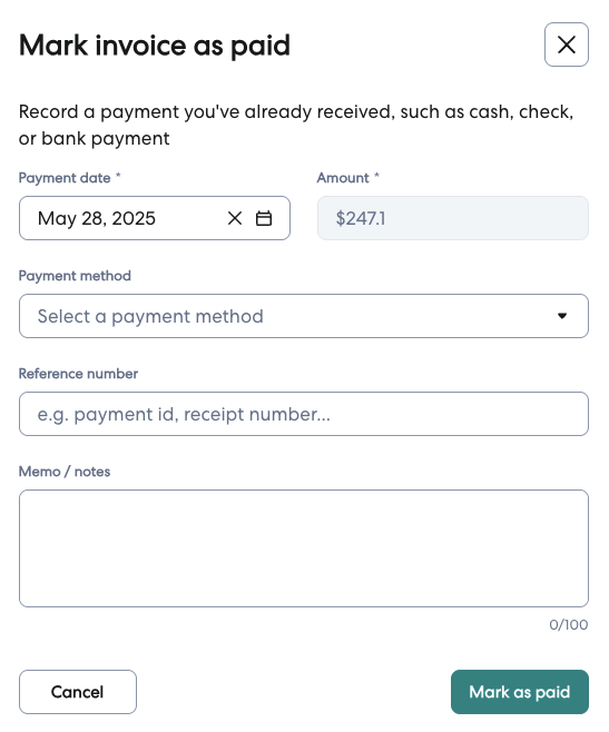 7- You can edit the payment details if you wish. Once done, select the Mark as paid button. To cancel this action, select Cancel.