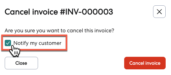 6- In the pop-up window, confirm that you want to cancel the invoice. You can notify your customer about the cancellation by checking the notification box in the pop-up.