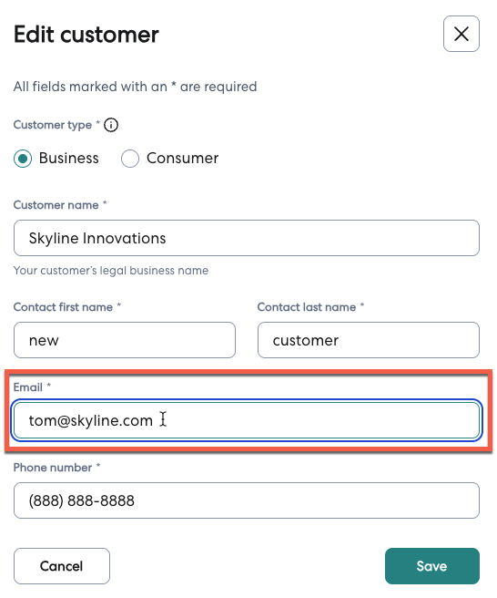 6- In the Edit customer window, make changes to the customer's email address.
