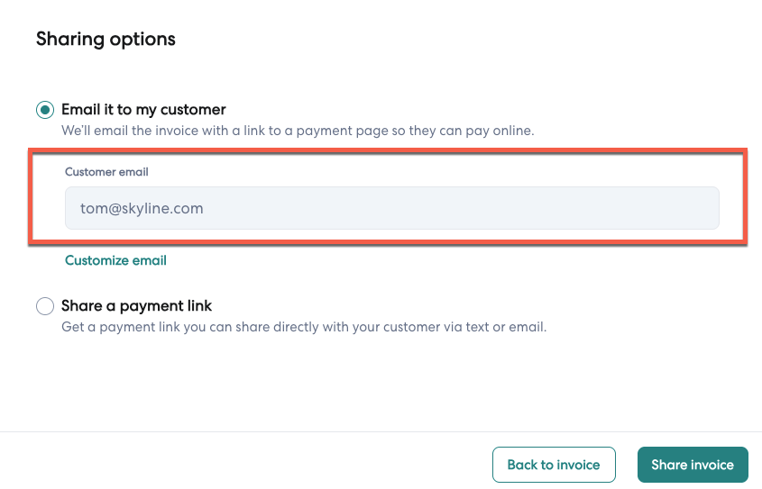 13- Under sharing options, the customer's updated email will be listed in the Customer email field.
