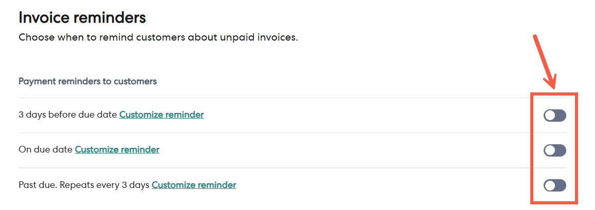 3 - On the Invoice reminders screen, turn off the toggle next to the reminder frequency you want to disable. You can turn off multiple options.