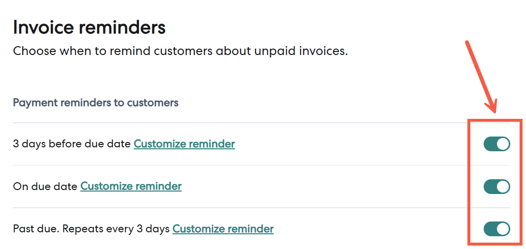 3 - On the Invoice reminders screen, turn on the toggle next to the reminder frequency you want. You can choose more than one option.