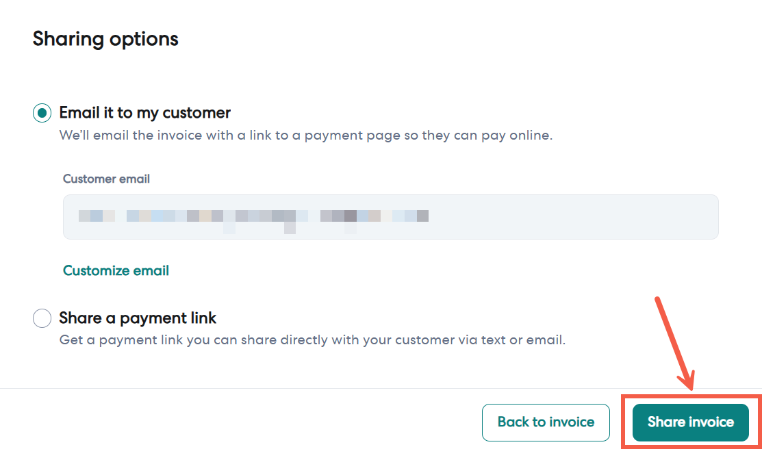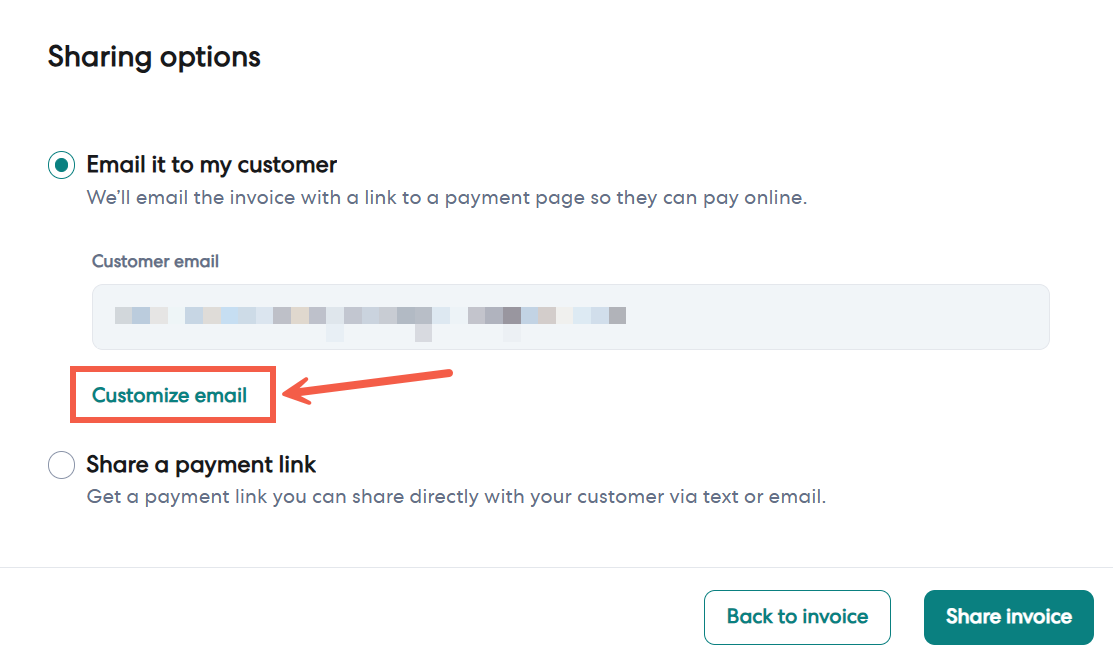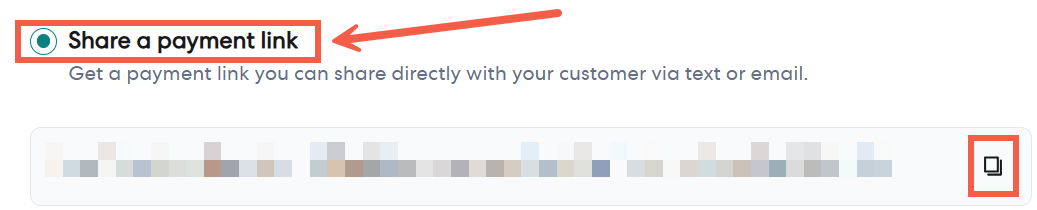 - You can copy a payment link and share it with your customer. To do so, select Share a payment link. Then, select the Copy this icon to copy the link.