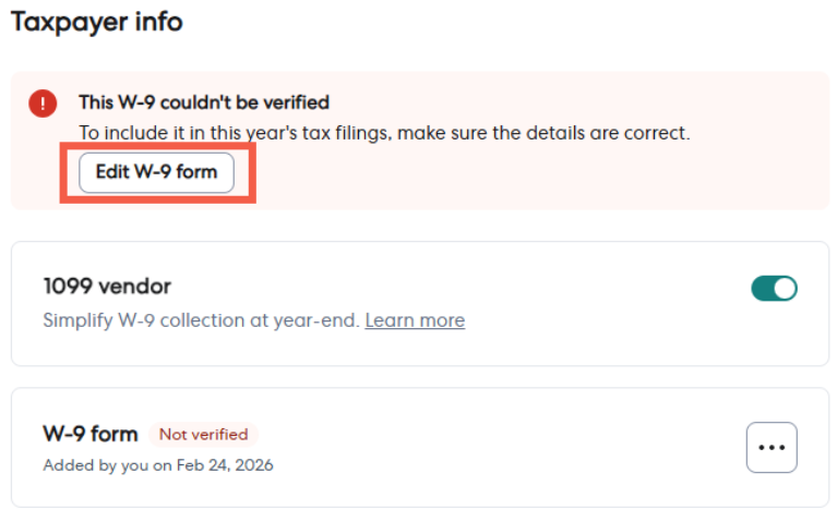 If a vendor's W-9 information is incorrect or unverified, you can edit the specific details yourself. This allows you to fix typos, update addresses, or correct Tax IDs immediately.
