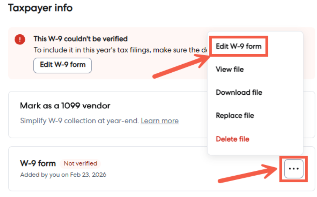 Alternatively, click the three dots icon next to the W-9 form section and select Edit W-9 form.
