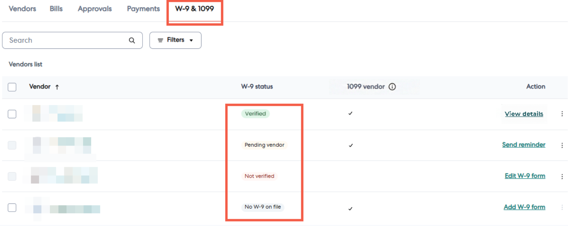 1 - From your Pay dashboard, open the W-9 & 1099 tab. This view displays the W-9 status for all your vendors.